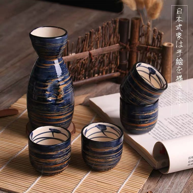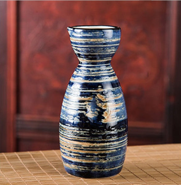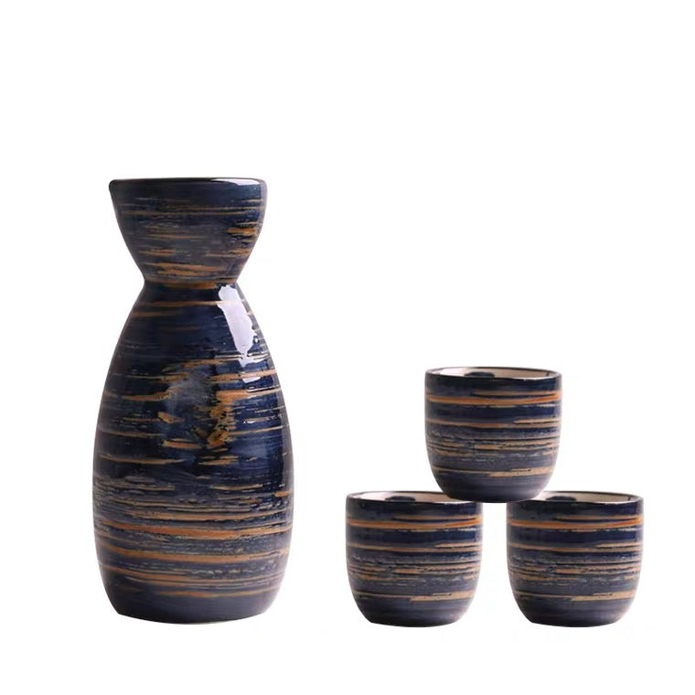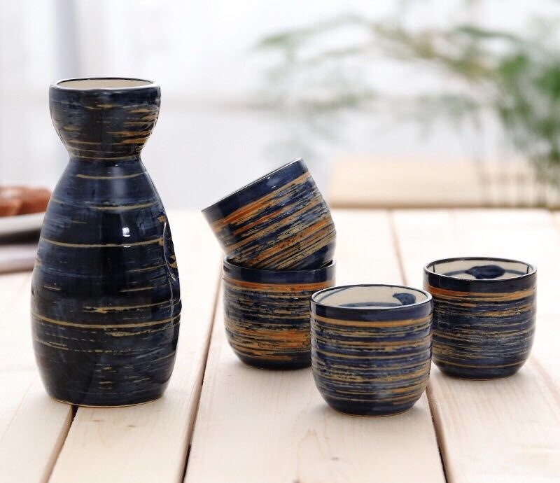 This beautiful Sake set is made from high-quality ceramic and features rich blue with textured cream and orange swirled decoration. You can use this beautiful sake set at your next event to entertain guests or arrange it on any table or counter top to add exquisite style to any room. Make this perfect sake set your favorite sake tool. This unique sake decanter set is heat resistant. Ingenious bottle design to prevent water from leaking.