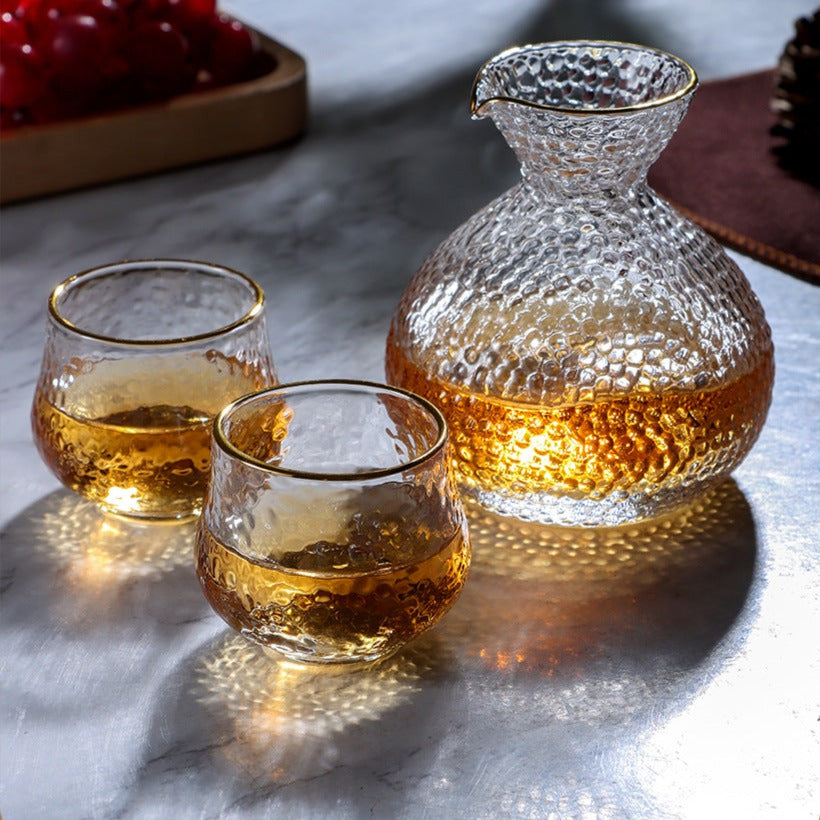 This Golden Edge Glass Sake Set features a unique hammered glass pattern. This exquisite set includes a Sake bottle and four cups, each adorned with a luxurious golden edge. The hammered glass design adds a tactile element, elevating your sake-drinking experience.
