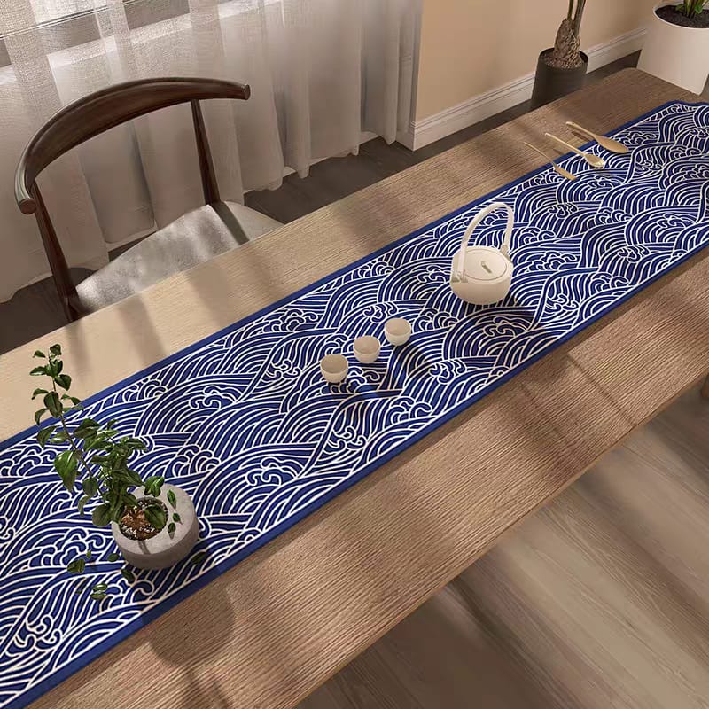 Featuring a traditional Japanese blue ocean wave motif on a deep navy background, this waterproof PVC leather table runner blends modern simplicity with timeless elegance. Perfect for dining tables, tea settings, or minimalist home décor.