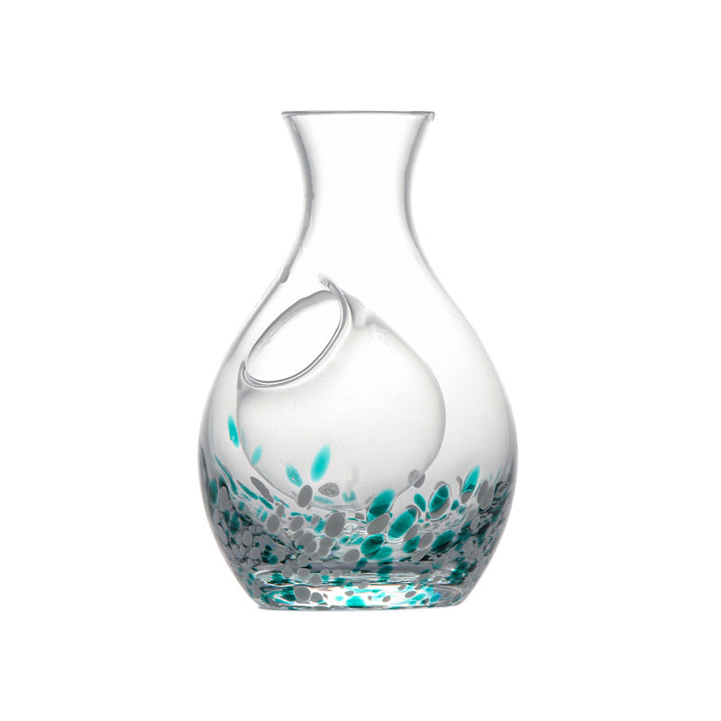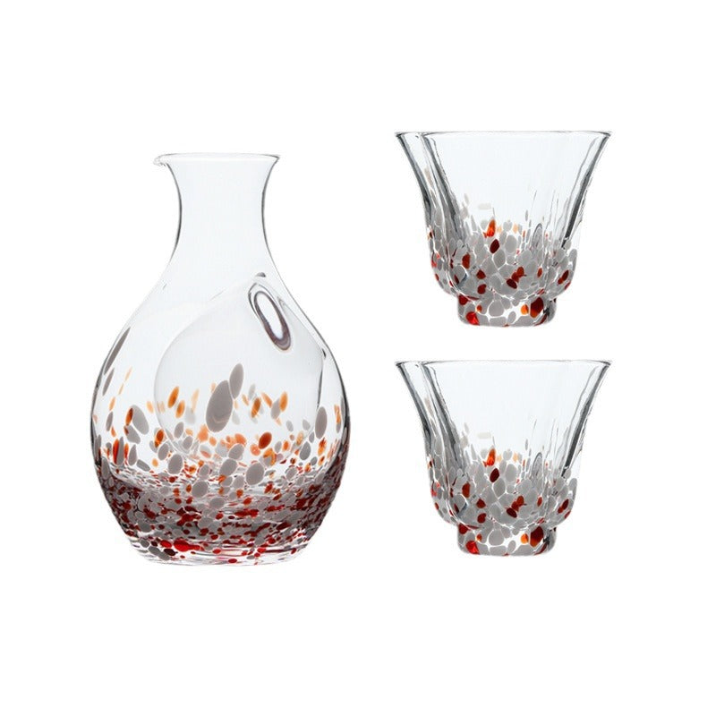 This glass Sake set features charming white with pink or white with green spot accents. The set includes a sake pot and two matching cups, each adorned with delicate, colorful spots that capture the essence of traditional Japanese artistry. The set also features a unique "ice pocket" within the sake pot, designed to cool your sake or whisky without watering it down