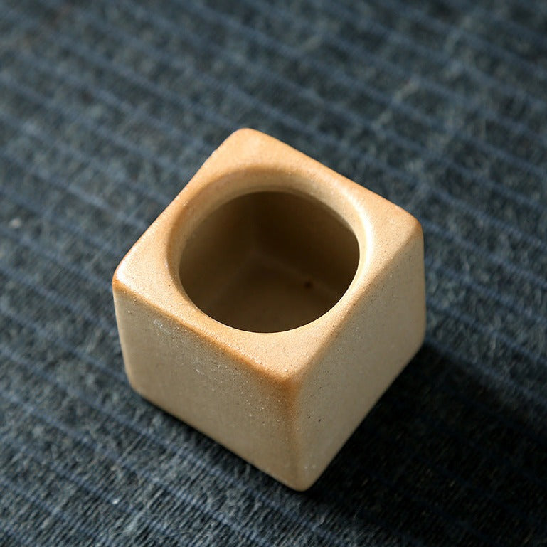 This exceptional product showcases a stunning stoneware cup, skillfully molded into a cone shape, which fits seamlessly into a carefully crafted ceramic cube in reverse.