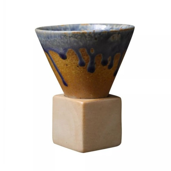This exceptional stoneware cup boasts a stunning cone shape, which fits seamlessly into a thoughtfully designed ceramic cube in reverse. Featuring a leaking blue paint pattern, turning each cup into a unique masterpiece.