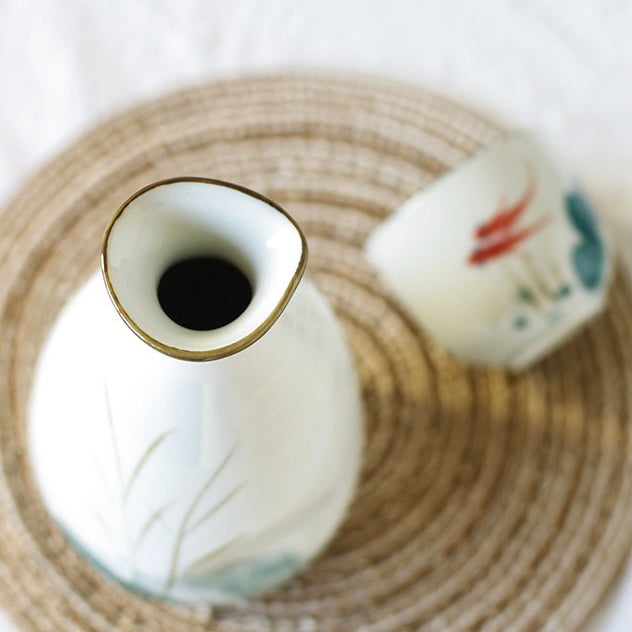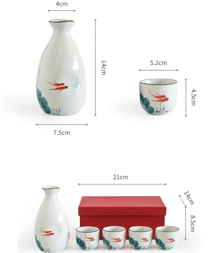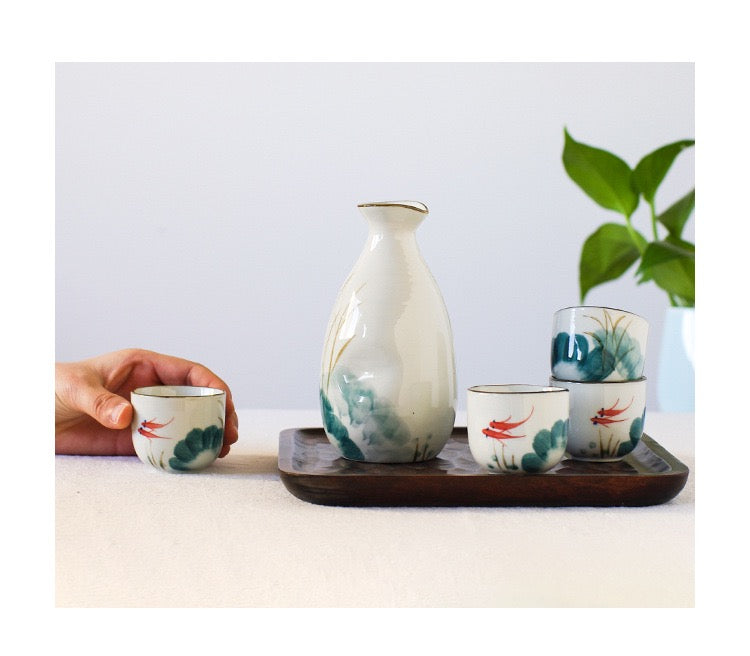 This is a Japanese ceramic sake serving set that includes a decanter (called Tokkuri) and 4 cups (called Ochoko). It features a goldfish painting on the decanter and cups. A great gift idea for any lake lover. It is also a perfect house warming gift.