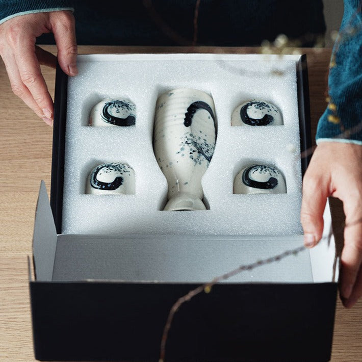 This Sake set is designed with an eye-catching Zen circle painting that brings the minimalist Japanese style to any occasion. This sake set can be used as home decoration, or as a holiday gift for family and friends.